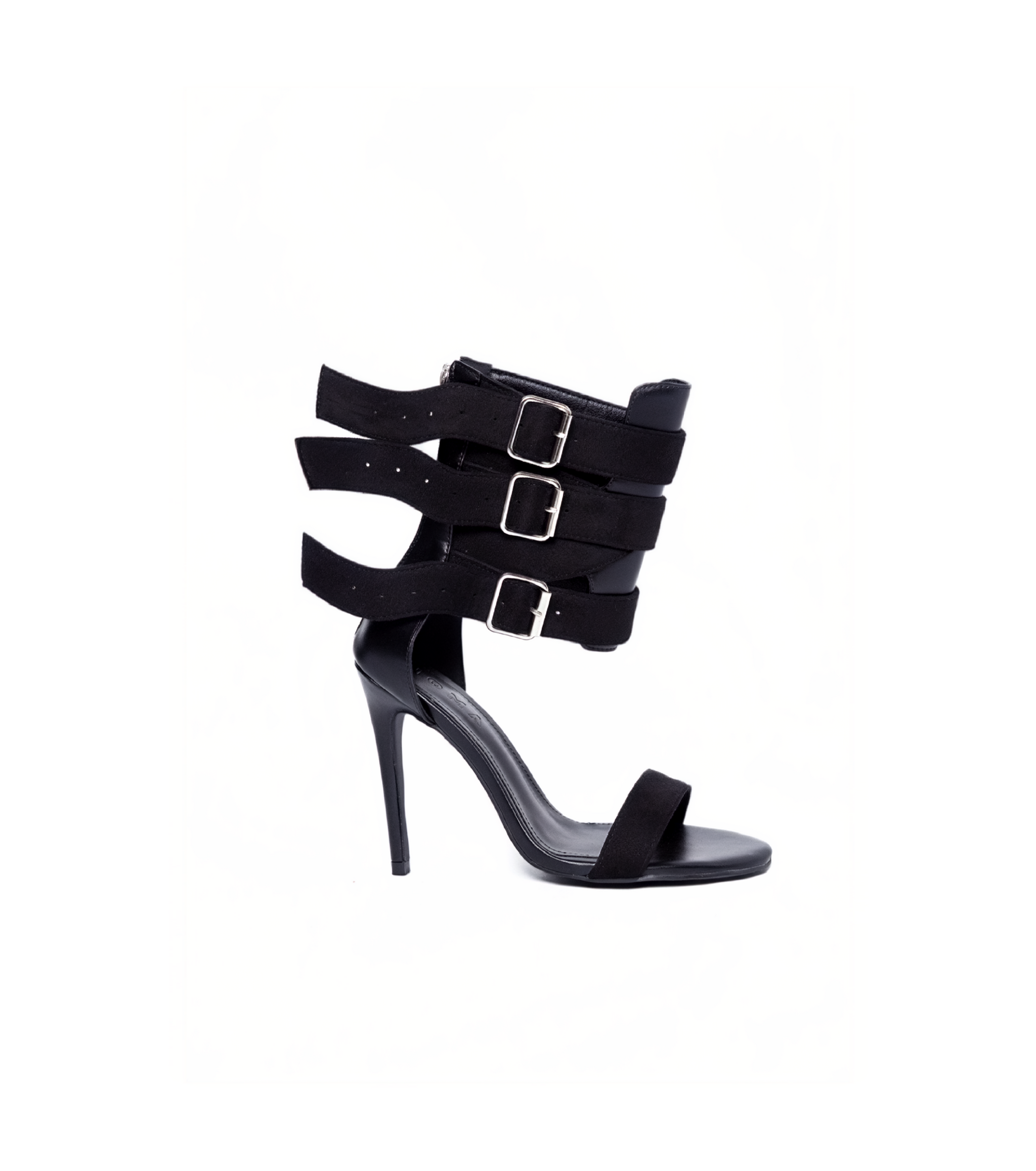 Three horizontal straps across the ankle with a silver buckle.